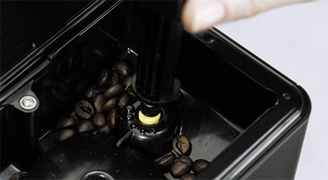 Можна вибрати налаштування помелу за допомогою регулятора всередині ємності для кавових зерен – від дрібного помелу для міцного еспрессо до грубого помелу для більш м’якої кави. Виконуйте налаштування помелу лише тоді, коли апарат меле кавові зерна. Щоб налаштувати кавомолку, поставте чашку під носик подачі кави. Натисніть кнопку "Espresso" (Еспрессо), і коли кавомолка починає молоти, змініть налаштування за допомогою кнопки налаштування.