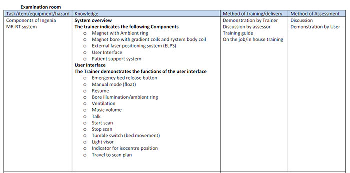 with “MR local rules” governing regulatory requirements for safety in the PBT department; helping recruit the therapeutic and diagnostic radiographers comprising the permanent PBT pre-treatment team; assisting in identifying training needs; safety training; and developing the initial sequences with the Philips applications training team and other pre-treatment team radiographers.