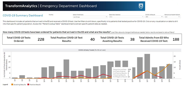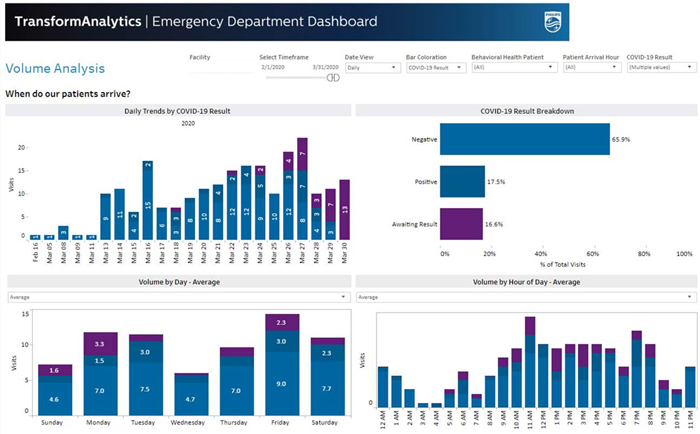 Data analytics and dashboards Analytics consulting and custom performance dashboards provide data-driven insights on patient volume, scheduling, flow, room utilization, and more including COVID-19 data such as patients presenting with symptoms, confirmed diagnosis, patient origin mapping, and trends.